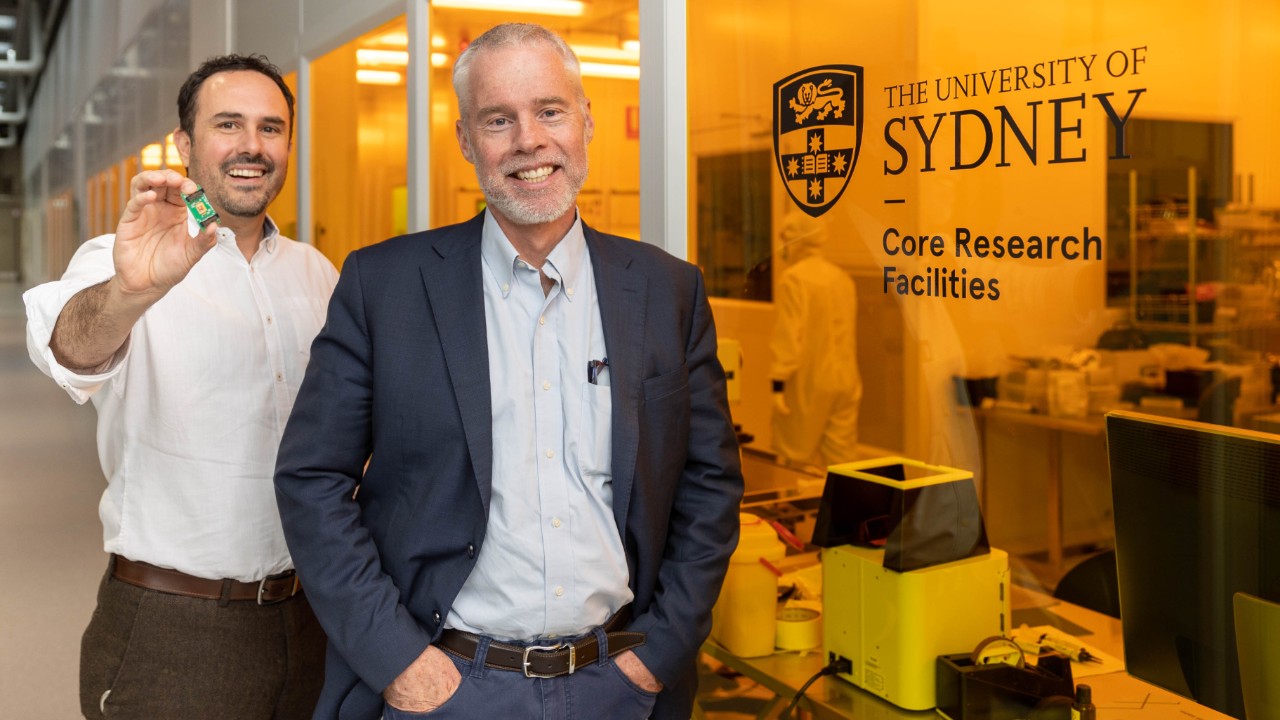 Dr Alvaro Casas Bedoya, holding the new chip, with Professor Ben Eggleton in the Sydney Nanoscience Hub. Photo: Stefanie Zingsheim