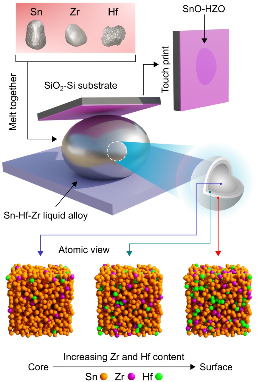 The liquid metal alloy has a thin oxide layer or ‘crust’ while maintaining a liquid centre. It is used to harvest the ultra-thin tin oxide nanosheets doped with hafnium zirconium oxide.