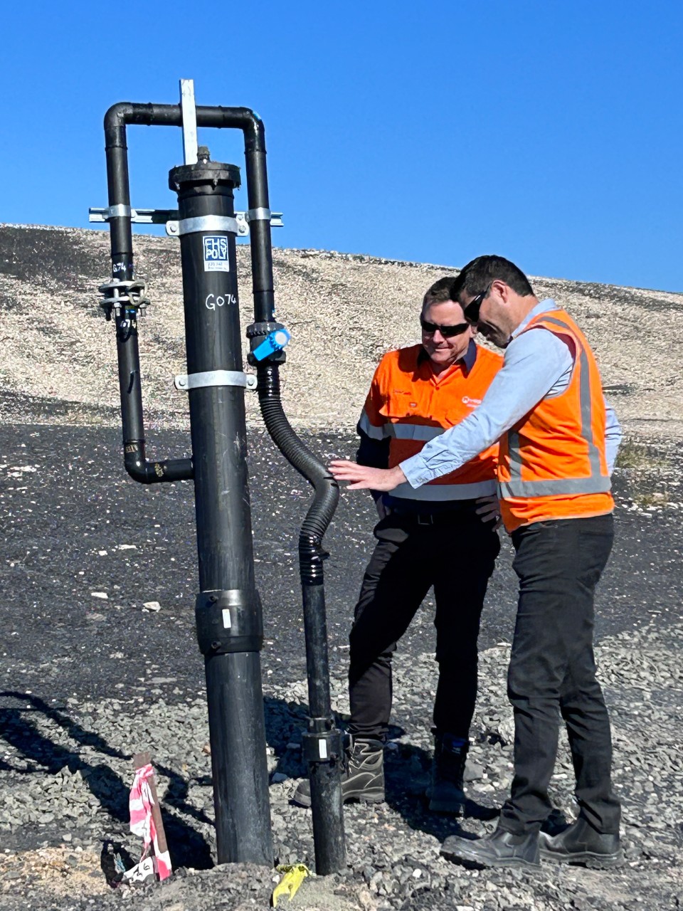 Professor PJ Cullen with Veolia Australia and New Zealand CEO and Net Zero Initiative board member Richard Kirkman next to a Veolia methane well. Image: Luisa Low, University of Sydney
