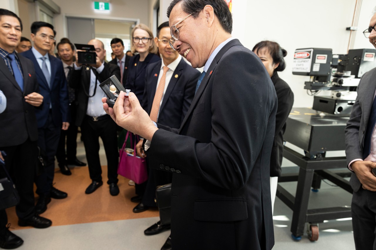 Ho Chi Minh City People’s Committee Chairman Mr Phan Van Mai inspects biomedical technology as part of a delegation which toured the School of Biomedical Engineering. Image: Fiona Wolf, University of Sydney