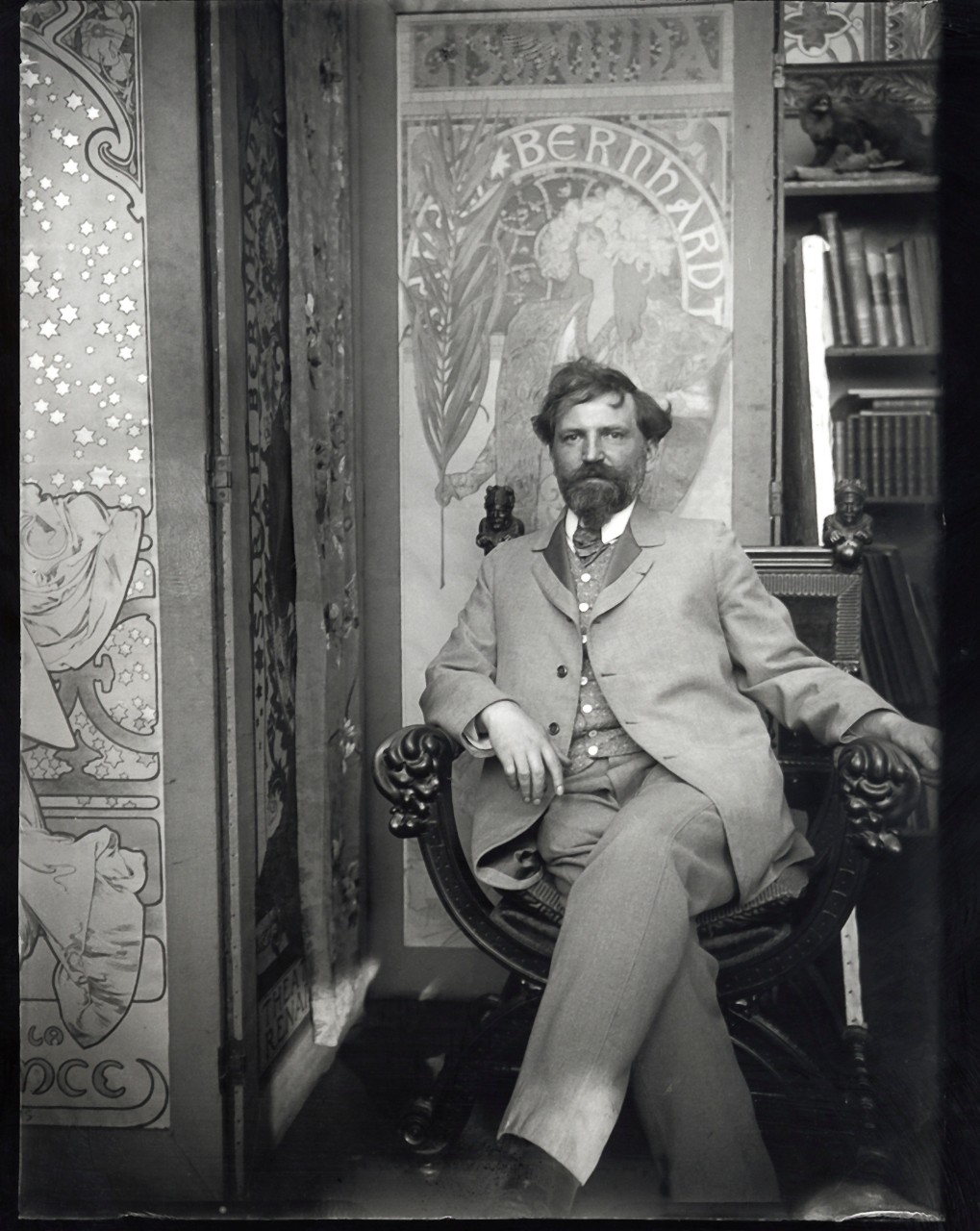 Self-portrait with posters for Sarah Bernhardt at Mucha’s studio in rue du Val-de-Grâce, Paris, c1901 © Mucha Trust 2024.