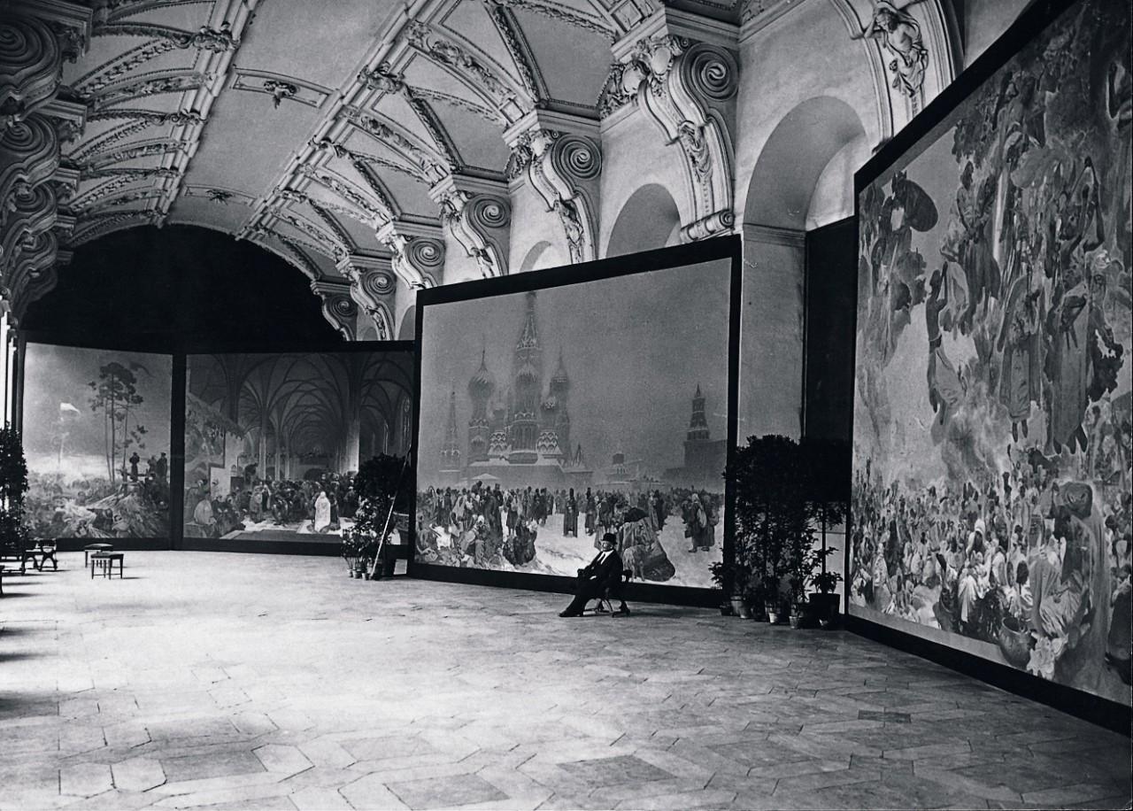 Mucha with the Slav Epic canvases as exhibited in the Klementinum, Prague, 1919 © Mucha Trust 2024.