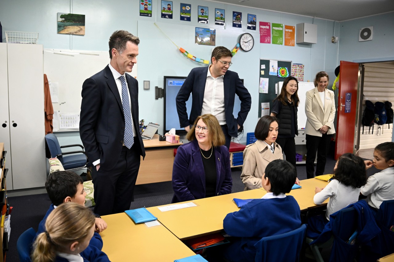 Premier Chris Minns, Donna Davis, Jerome Laxale, and Prue Car meet with Year 2 students during a visit to Melrose Park Public School. Photo: Bianca De Marchi/AAP.