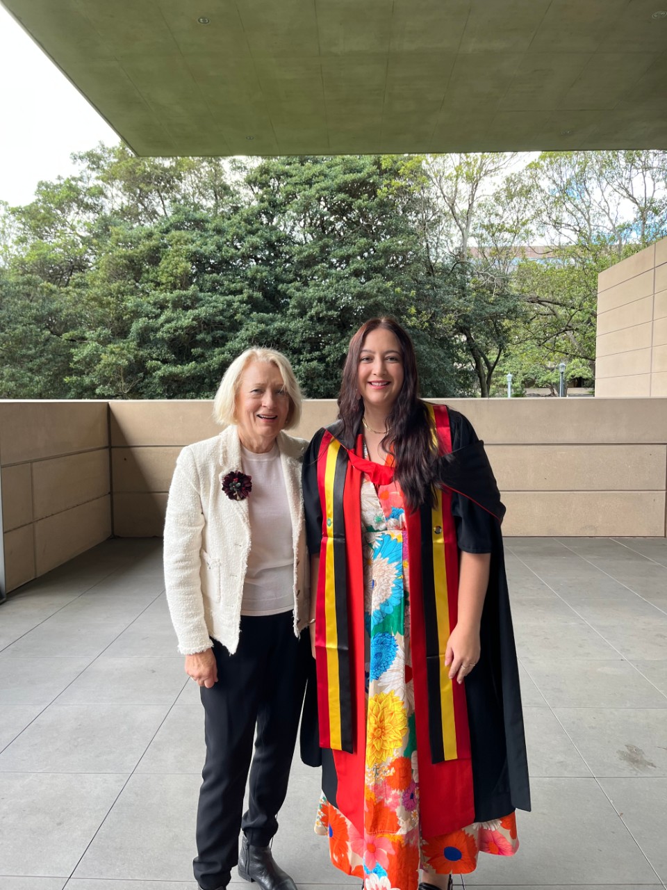 Margaret Turner (left) and Simone Sherriff (right) reunite after the graduation ceremony.