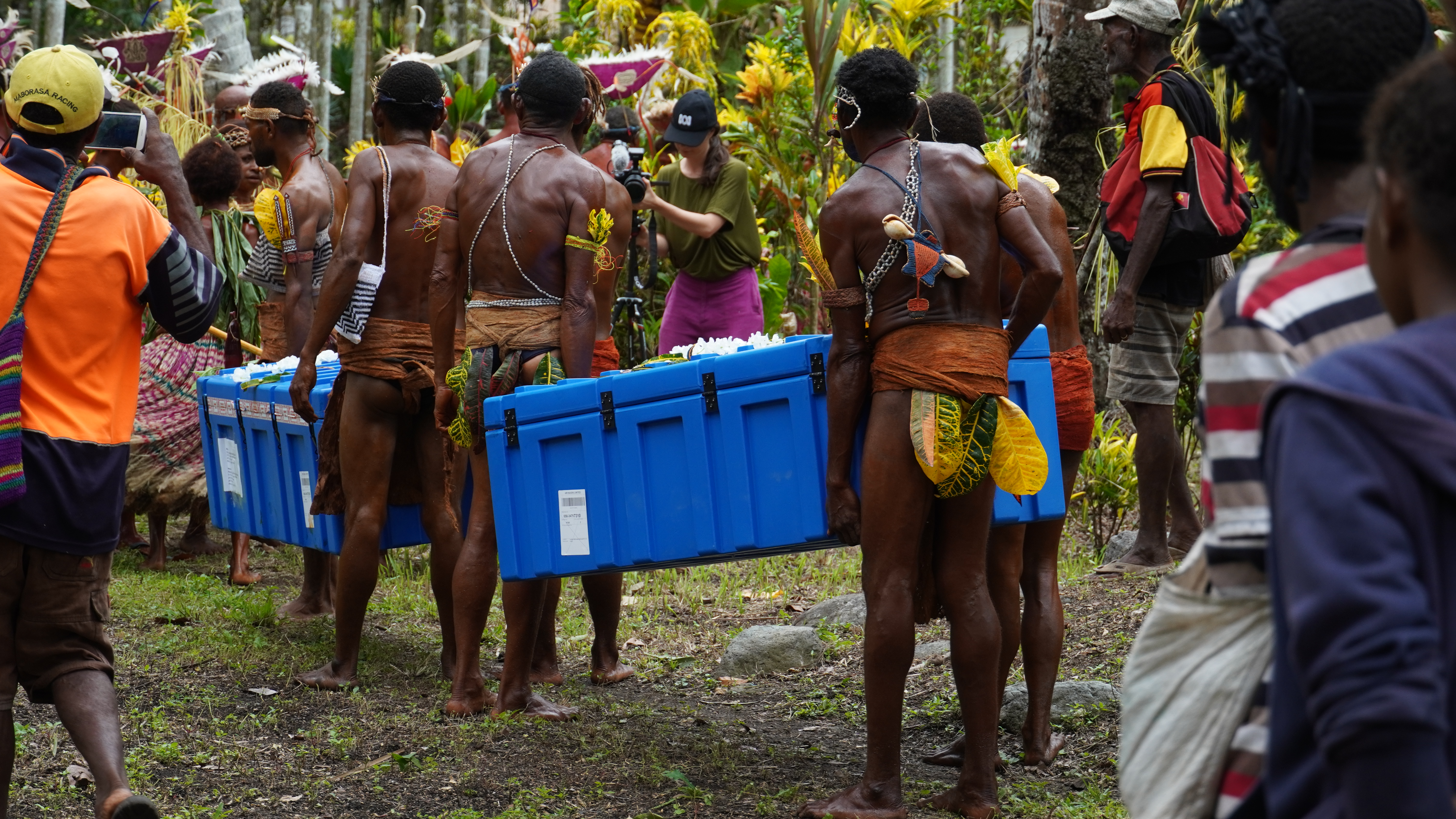 Met by men dressed as warriors, the blue boxes containing the 16 ancestral remains were unloaded and taken up to ceremony space at Gorendu. Photo by Norman Ketan, NKW Photography