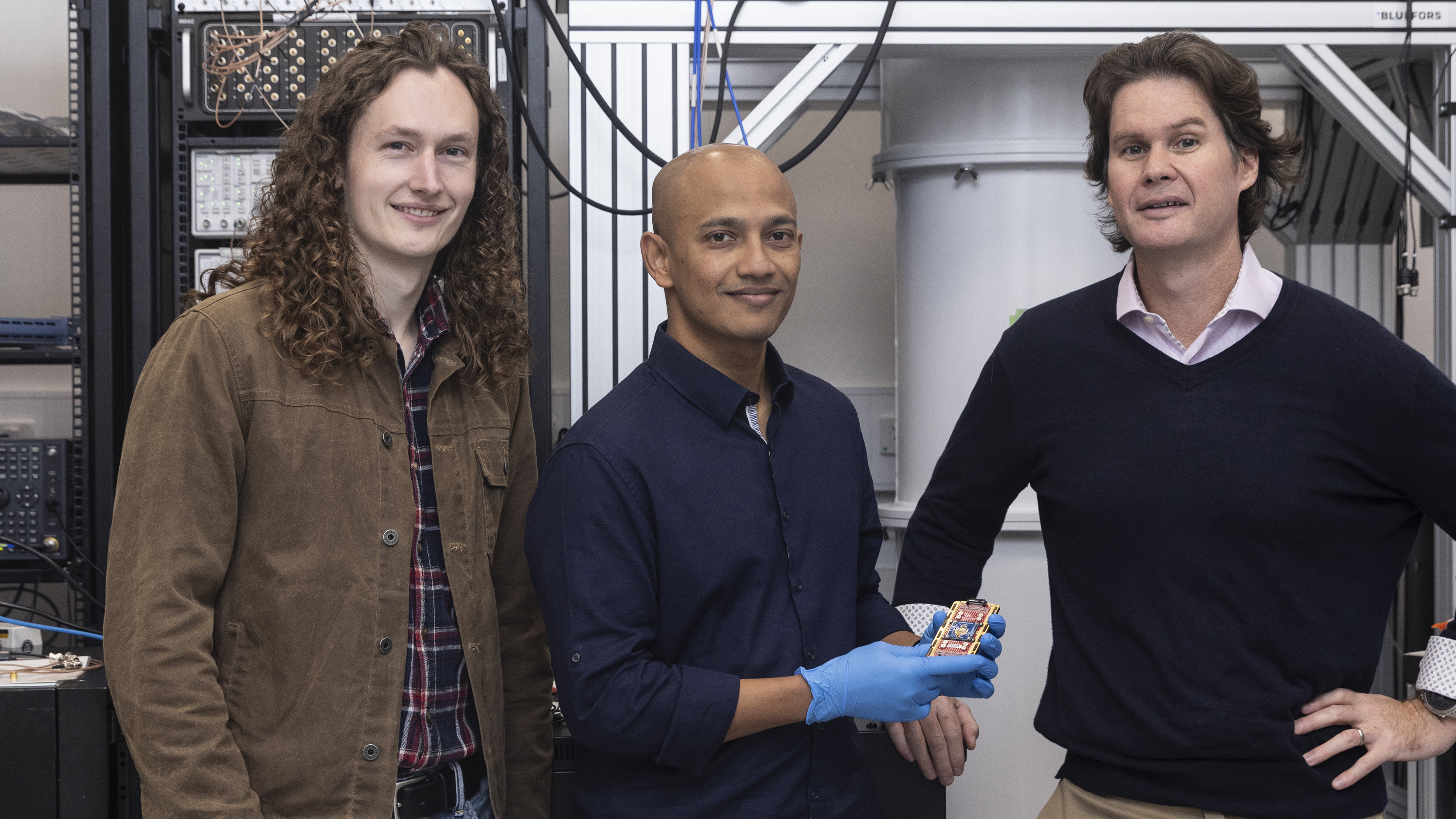 Research team (from left): Dr Kushal Das, Dr Sam Bartee and Professor David Reilly outside the Sydney Nanoscience Hub at the University of Sydney. Photo: Fiona Wolf