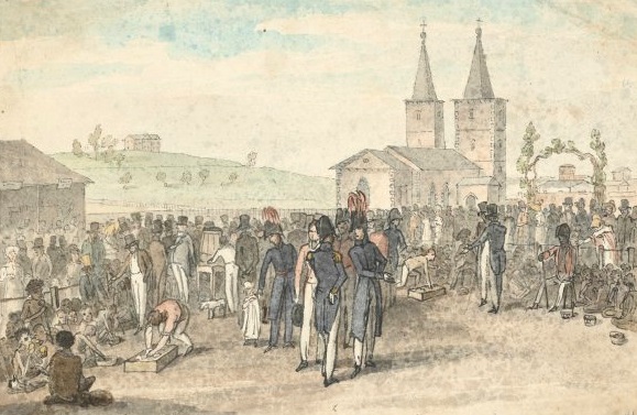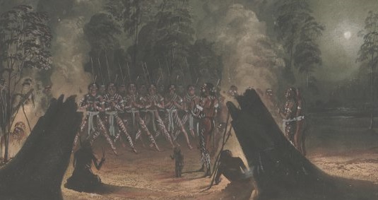 A gentleman, on guard during the black war, watched a small group in the gaol yard round their night fires. One of them raised his hands, and moved them slowly in a horizontal direction; and spreading, as if forming an imaginary fan or quarter-circle: he turned his head from side to side, raising one eye to the sky, where an eagle hawk was soaring. The action was accompanied by words, repeated with unusual emotion: at length they all rose up together, and uttered loud cries. The whole action had the appearance of an incantation.