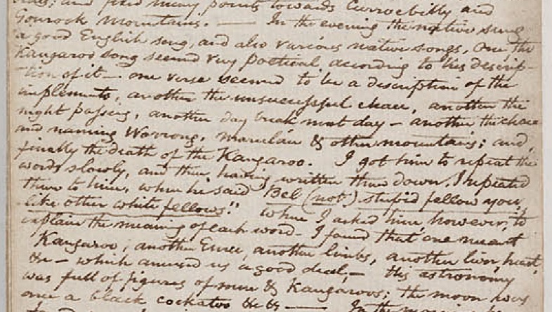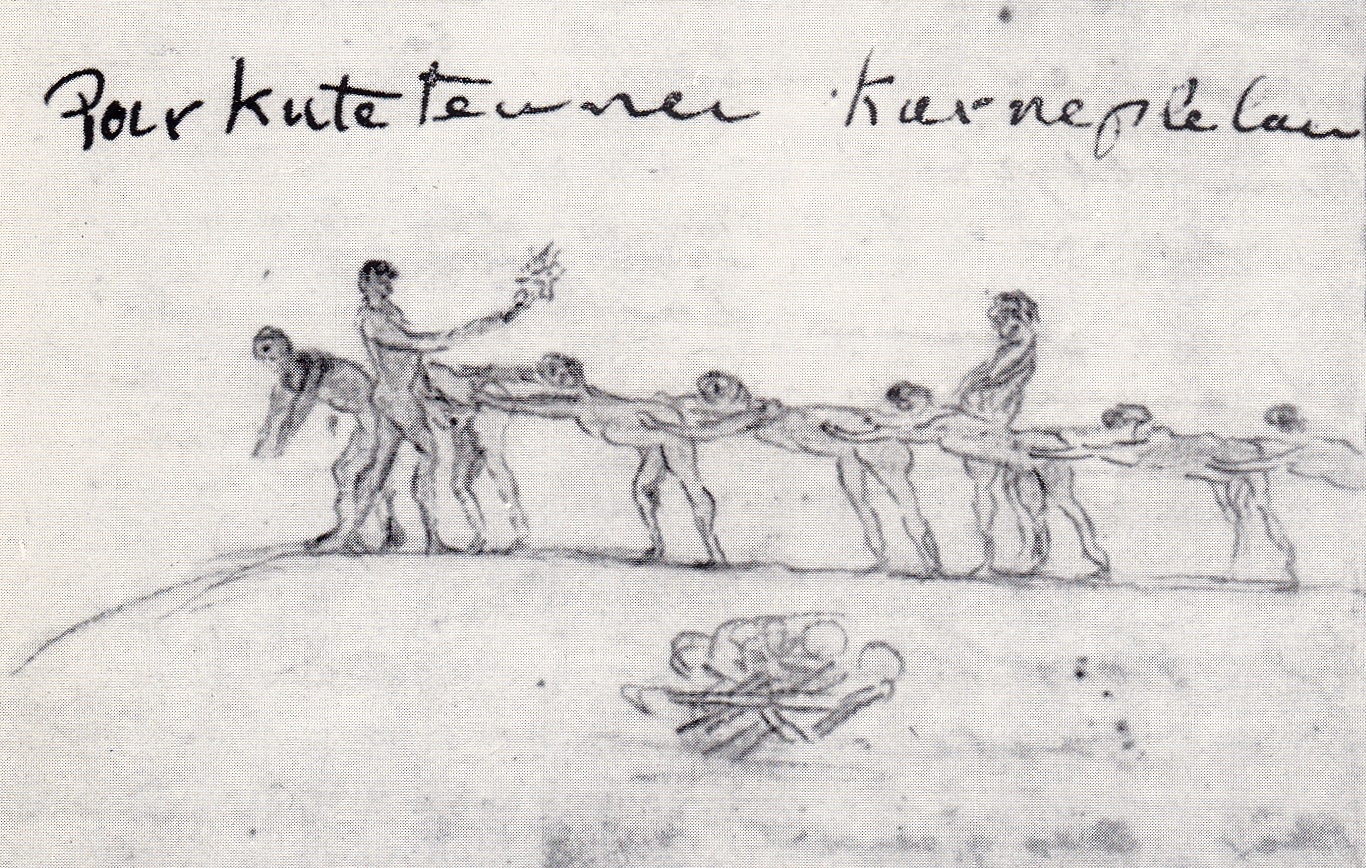 Tonight the natives joined in a little hilarity. I was pleased to be there. The native dances of the east are various and consist principally of performing a circle round the fire, striking the ground with one hand and them jumping up. In performing different attitudes similar to what they practise in war they avoid the spears, called by the eastern native PRAR.EN.ER. At the same time they sing their exploits. The women also join, but the dance is principally carried on by the men. Some dances consist in a relation of some amorous story, which is accompanied by different attitudes, but the most interesting is the PARE.KATE.TEN.NER KAR.NE.PLE.LARE.NE or horse dance. This originated in the circumstance of TAR.NE.BUN.NER having outrun a man on horseback, who was in pursuit of him. Several men perform the part of horses: they stoop down and lean their hands upon the back of their companion and then walk around the fire singing; sometimes they run to imitate galloping. One man acts as driver and he has a bough for a whip, with which he strikes them and makes them go fast. Another man runs beside the horses in imitation of a dog - and performed his part exceeding well, shaking his head and appearing frightened, then stopping, then running &c. ...