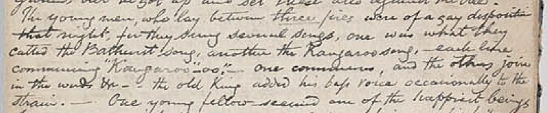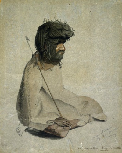 [287] [5 December 1830] ... Tonight conversed with the natives. Said that snakes kill plenty of natives ... Said native see white man coming, go back; that the devil tells him to go back. The Brune natives said that the Brune devil is thunder and lightning. Said that LUG.NE.MENE.NER's brother made the PARE.KUTE.TEN.NER song and that the crawling in the dance belongs to the Lake mob. They sung a song which they said belonged to Walyer's mob. Jumbo [BULL.RER] said the big woman cut her with a knife because she did not give her bread. In the absence of red ochre the natives take the red leaves of peppermint and other trees.