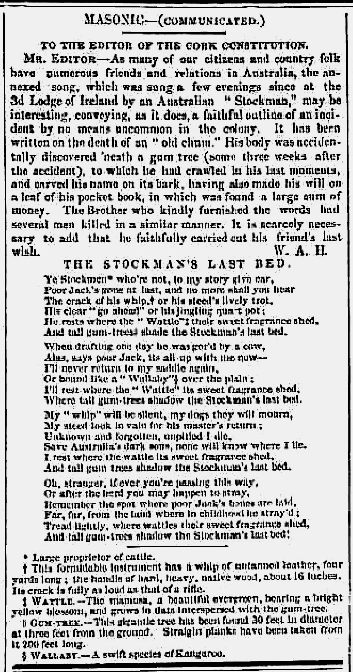 The Stockman's Last Bed; "Be ye stockman or no, to my story give ear," The Stockman's Lone Grave; First known date: 1888 [sic]; AustLit