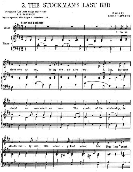 "The stockman's last bed. Music [arranged] by Louis Lavater", in Swagman's treasure five camp-fire ditties; words from "Old bush songs" collected by A. B. Paterson (Melbourne: Allan & Co., 1938)