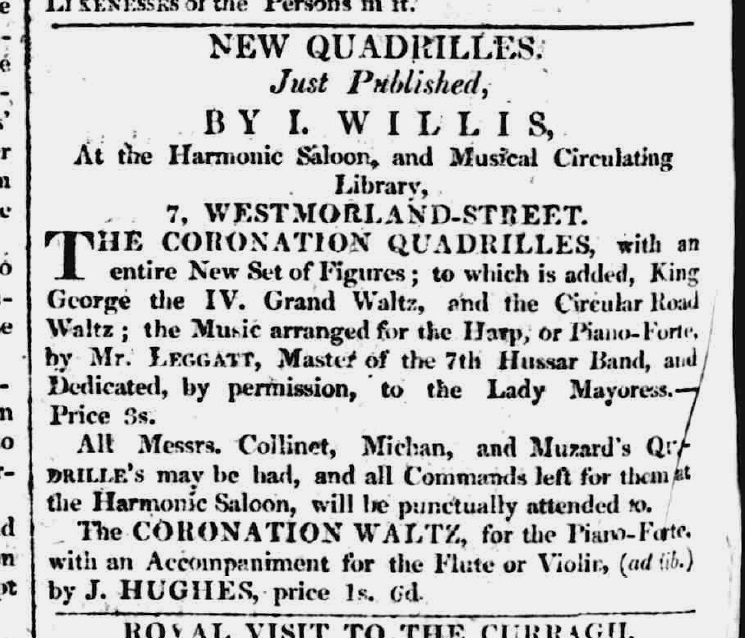 NEW MUSIC. This Day is Published, BY I. WILLIS, At the Harmonic Saloon and Musical Circulating Library, NO. 7, WESTMORLAND STREET . . . THE CORONATION QUADRILLES, with new Figures, and composed by Miss Crawford. Price 3s. . . .
