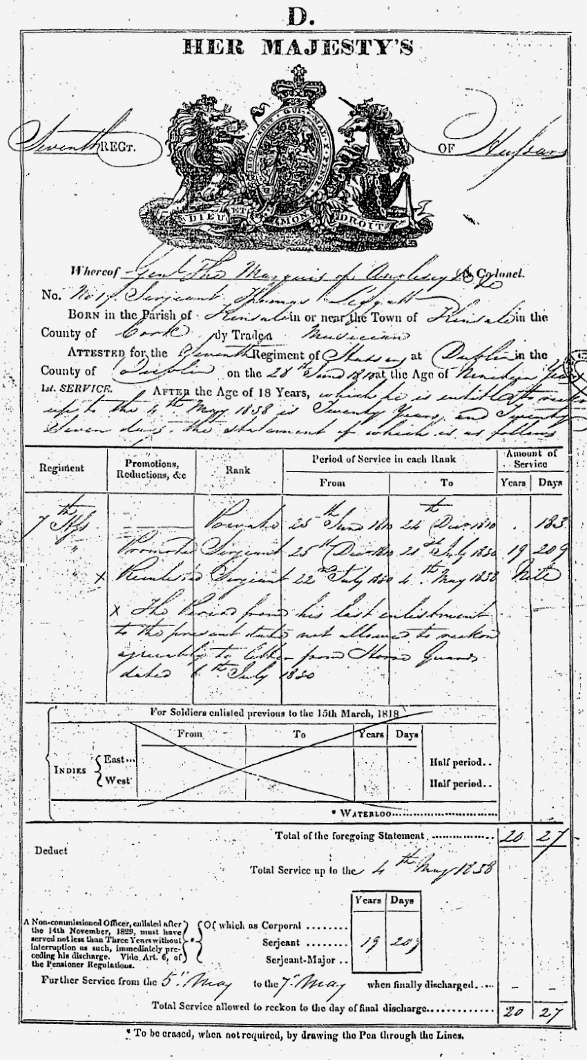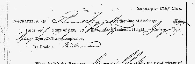 When it was announced that the regiment was being redeployed to Canada, he requested a discharge from the Hussars, which was granted on 4 May 1838. Pension registers show that on 12 September 1838 Thomas Leggatt, born in Kinsale, Cork and 47 years of age, having served 27 years 10 months and discharged at his own request, was awarded a gratuity of £19 15s 5d, and approved for an ongoing pension of 1s 8d per day, for the collection of which he was listed as resident in New South Wales, his death there on 30 April 1846 being also duly noted.