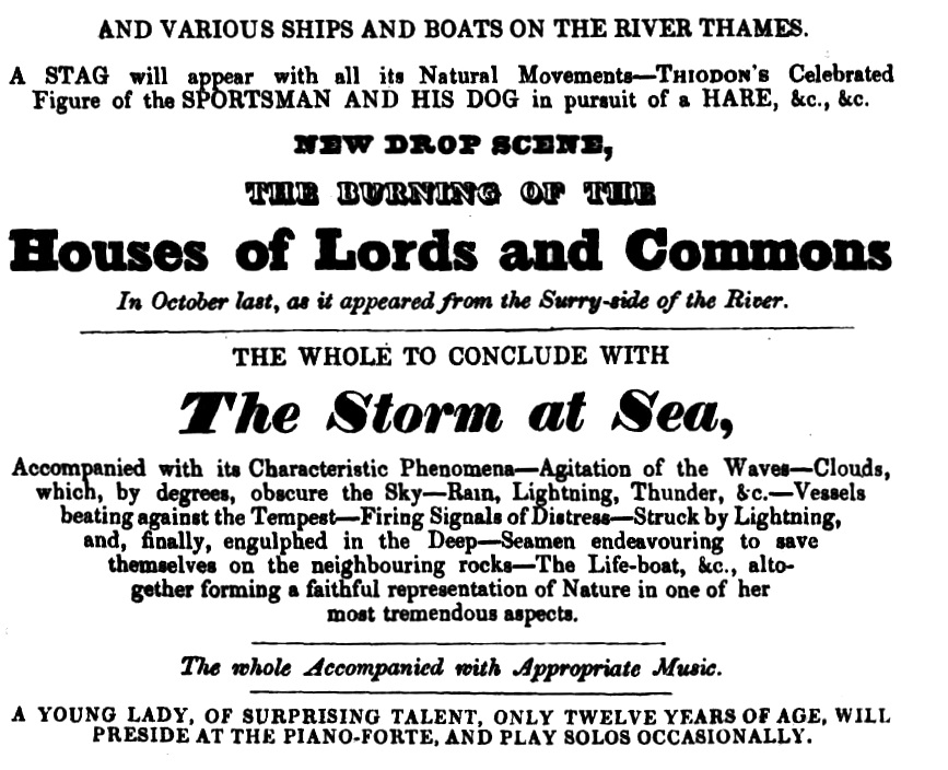. . . an Entertainment of the most novel and amusing description, on the plan of the celebrated Monsieur Thiodon's Theatre of Fine Arts, which consists of a Series of beautiful Ciews, variedfrom time to time, of all the most celebrated places in the world, not on a flat surface, but by absolute scenic models, retiring from the spectator, ships, Boats, Figures, &c., moving by mechanical means, forming a charming coup d'ail, that will delight and surprise the beholder.