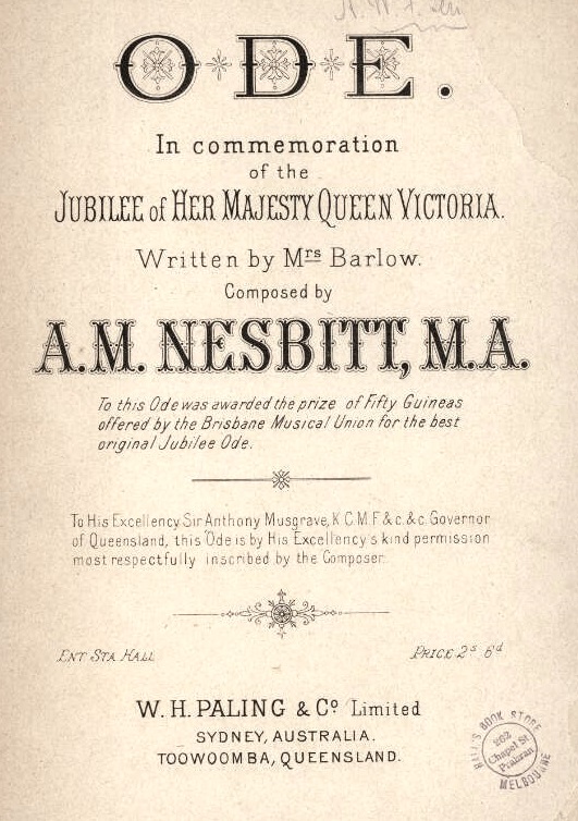 Jubilee ode (written by the Town Clerk of Melbourne [E. G. Fitzgibbon]; Composed by J. H. M. (of the City Treasurer's Office Melbourne); harmonised by H. C. Nott (organist Christ Church St. Kilda)"; Manuscript, composer's signature [1887]