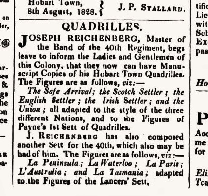 . . . In the same year (1825), Mr. Reichenberg, music master of the 40th Regiment, composed a set of "Australian Quadrilles" . . .