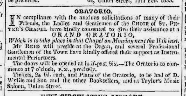 Oratorio on Paradise Lost performed at St. Andrew's Catholic Chapel, Glasgow; in Australia in 1839, W. A. Duncan identifies it as James Reid's composition.