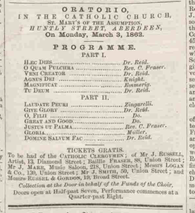 In correspondence, James Reid referred to his "uncle", the Catholic priest and composer, Charles Fraser (1789-1835), of Aberdeen (Gillis 1835), also an alumnus of the Scots school in Regensburg. Charles Fraser was indeed his mother's brother. Another family member was Elizabeth's maternal uncle James (Gallus) Robertson, OSB (1758-1820), ordained priest in 1782, who was still a professed monk at the Scottish monastery at Regensburg when James Reid arrived there as a boy in 1817 (Noden). Robertson was a missioner at Strichen, Scotland, in 1784 when Elizabeth Fraser was baptised.