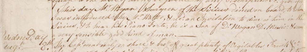 . . . This day Mr. Wogern Surgeon of the Sirius dined on board, to whom I was introduced by Mr. Watts, & rec'd a pressing invitation to dine on board the Sirius while we ly [page] in harbour, & to hear him play on the Piano Forte. He has a very fine one on board, is the Son of Dr. Wogern D: Mus: & seems a very agreeable good kind of Man.