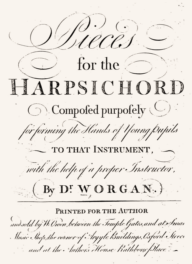 George Boucher Worgan presumably had received some formal training as pianist, perhaps from his father, though this is not known for sure. On the basis of Worgan's father's two London editions of Scarlatti's sonatas (Worgan 1752, 1771), the late Roger Covell whimsically imagined that it was "a matter of record" that, in addition to his piano, Worgan brought with him "a creditably antiquarian enthusiasm for the music of Domenico Scarlatti" (Covell NG2 2001). In fact, there is no known record of the sort of music that surgeon Worgan knew, liked, or might have played, apart from the two elementary pieces he set Elizabeth Macarthur to learn.