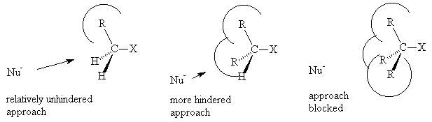 As the number of substituents around the carbon centre undergoing reaction increases, the substituents block the approach of the incoming nucleophile and consequently an SN2 mechanism becomes less favourable.