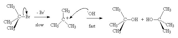 In the case of a tertiary alkyl halide, loss of the halide occurs first to give a carbocation which then reacts with the nucleophile. This is called a SN1 reaction (Substitution, Nucleophilic, first order).