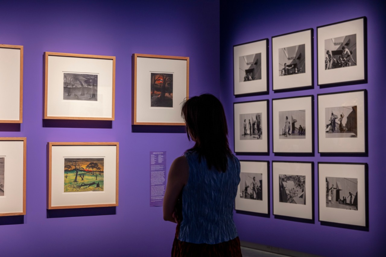 Foreground, left to right: Parnell Dempster, Stormy night, c1949; Arthur Bropho, Untitled, c1946-49; Parnell Dempster, Untitled, 1953; Background: William Yang, Forward to the Dreamtime performance. Sydney Opera House, 1976 (series). Photograph: David James.